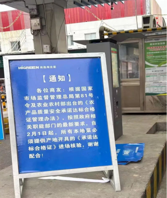 为强化政策执行力度,深圳农产品批发市场部构建多维度管控体系:一方面在市场岗亭显著位置张贴相关管理办法宣告牌,营造浓厚政策氛围;另一方面借助各商户交流群持续推送政策要求,明确告知商户需按管理办法提交完整、正确的报备材料,方可入场经营。通过前端宣传引导与入场管控相结合,有效帮助商户规范报备流程,从源头保障农产品质量安全。